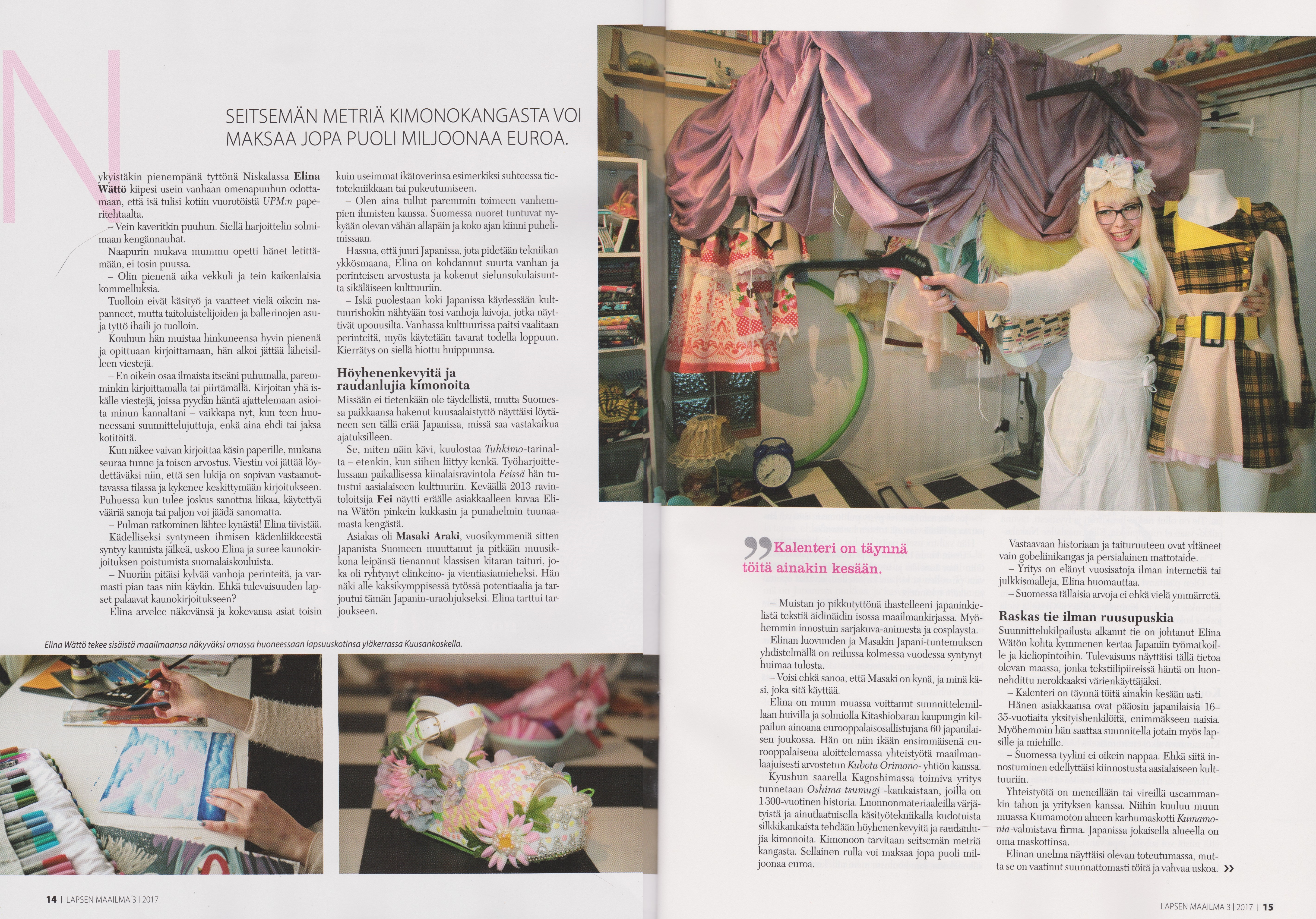 Sitä ennen Elina Wätöllä pitää kiirettä: opiskeluiden lisäksi hän aikoo valmistaa 5—10 uutta japanilaistyylistä asukokonaisuutta, jotka hän ottaa mukaansa Japanin-matkalleen.