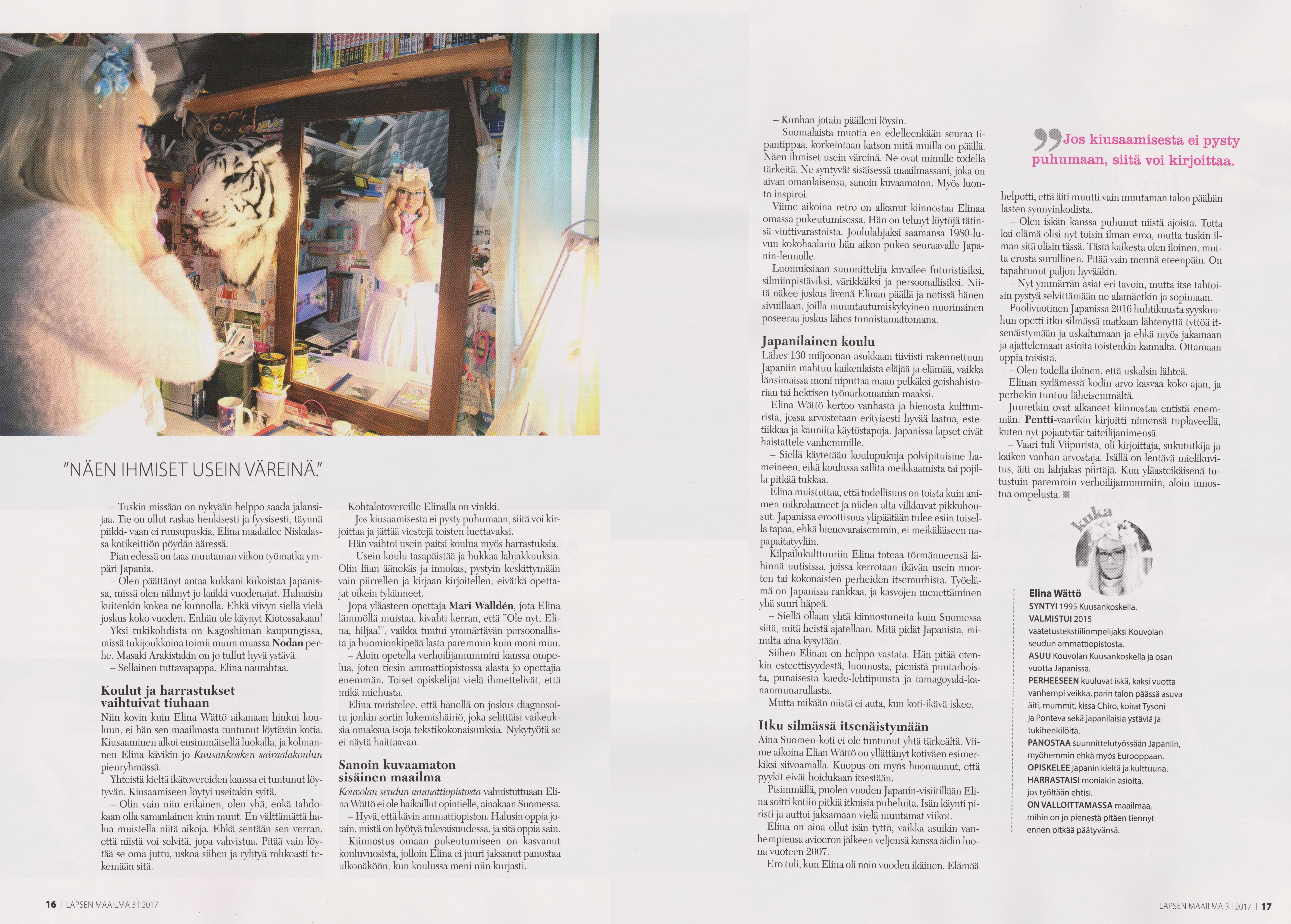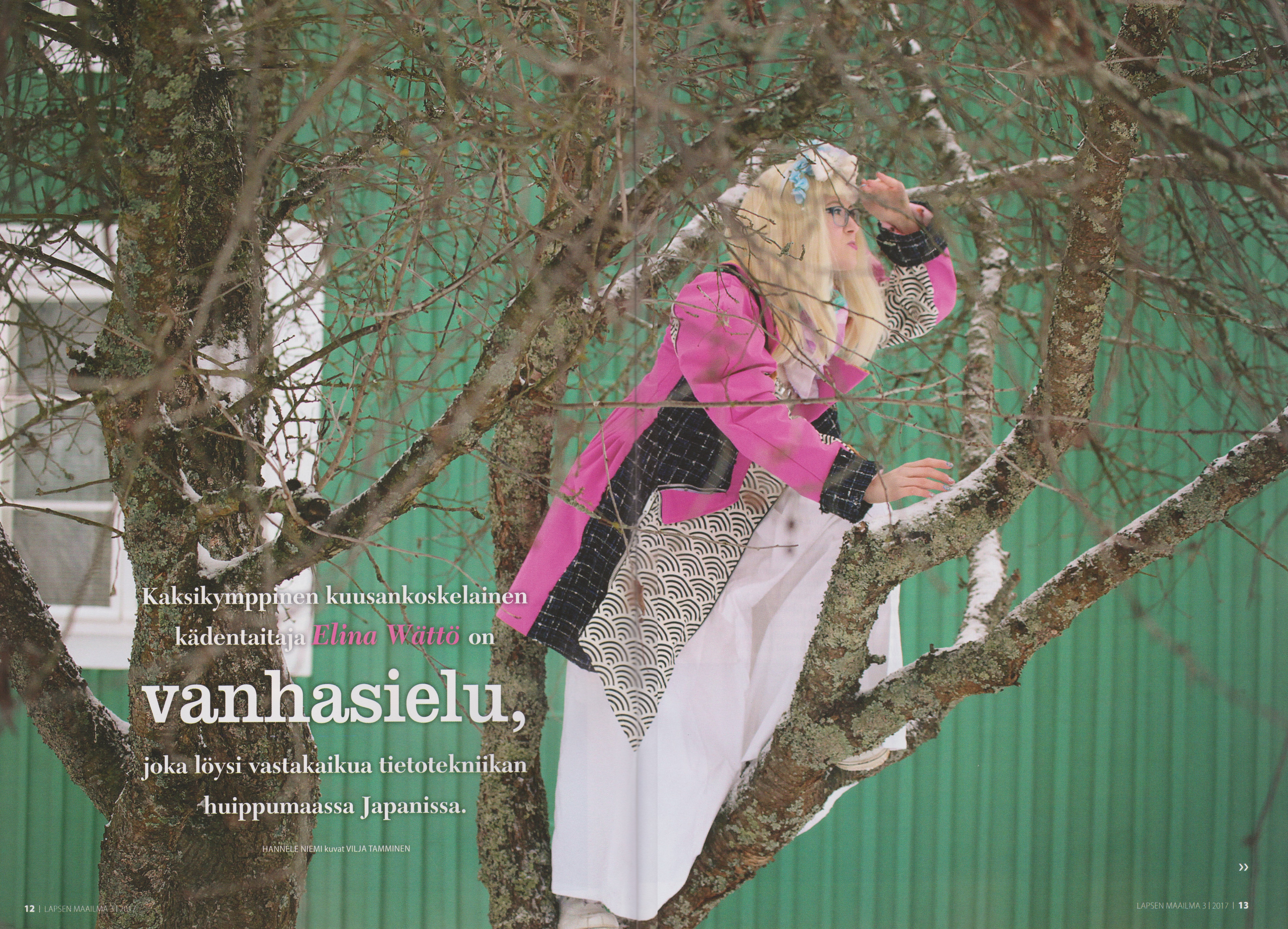 ”Urani on ilman muuta Japanissa, enkä seuraa länsimaista muotia lainkaan. Värimaailmani on hyvin värikäs ja sitä arvostetaan Japanissa”, sanoo Elina Wättö.