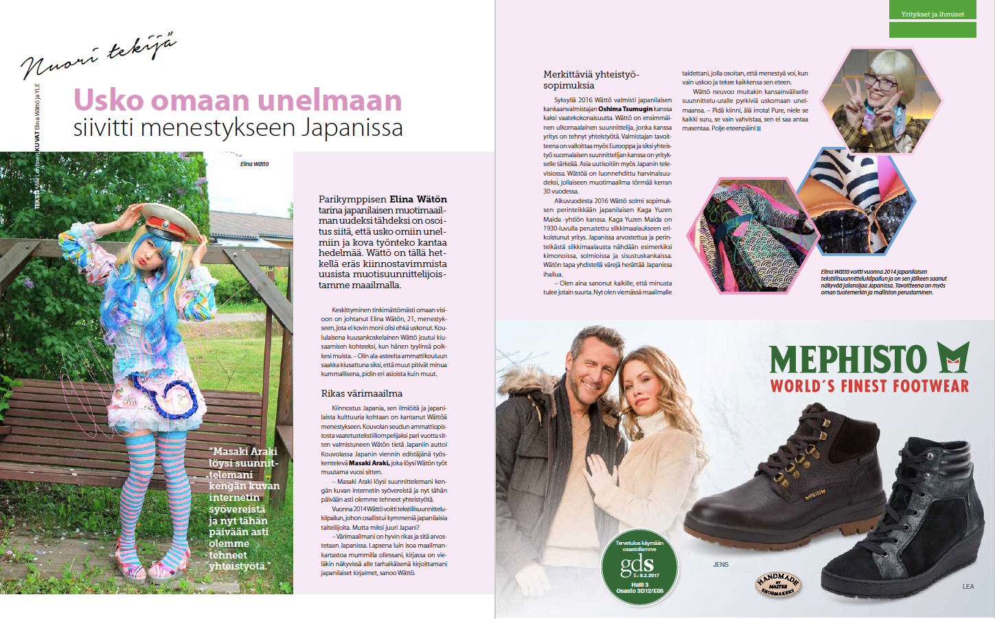 Viime keväänä Kouvolan seudun ammattiopistosta vaatetustekstiiliompelijaksi valmistuneen Elina Wätön tietä Japaniin on tasoittanut Kinnossa Japanin viennin edistäjänä työskentelevä Masaki Araki, joka löysi Elinan työt muutama vuosi sitten. Entinen avustaja on auttanut Elina Wättöä kontaktoinnissa ja sopimusneuvotteluissa.