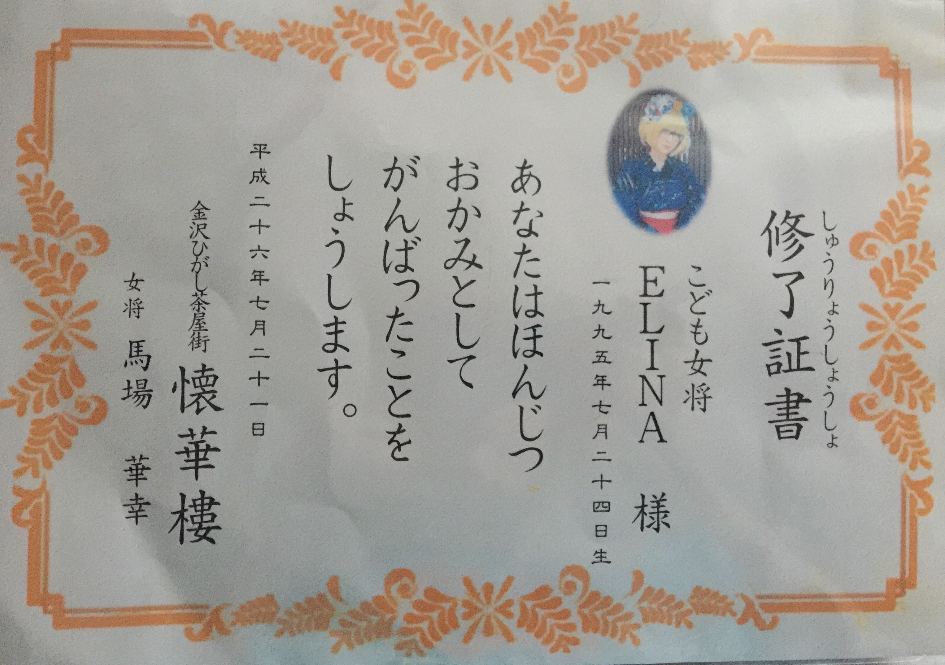 At Kanazawa, Certificate of Completion from famous Geisha